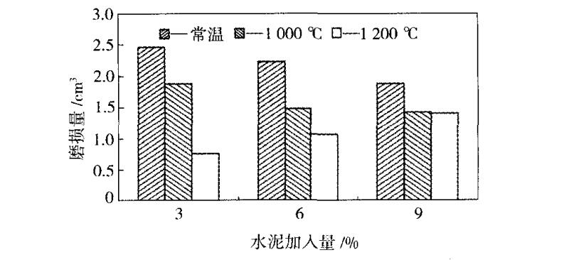 圖1為不同試驗(yàn)溫度下水泥加入量與高鋁澆注料磨損體積的關(guān)系。由圖1可看出,在常溫和1000℃條件下,隨著水泥含量的增加,高鋁澆注料的磨損量均逐漸減小。而在1200℃時(shí),隨著水泥含量的增加,澆注料磨損量卻略有增大。這是因?yàn)樵诔叵乱布春婵竞笤嚇拥目拐?強(qiáng)度和耐壓強(qiáng)度隨著水泥含量的增加而增大,所以澆注料磨損量降低;在1000℃時(shí),可能由于水泥引入的Ca0與材料中AL2O3、SiO2反應(yīng)形成一定數(shù)量的鈣長(zhǎng)石等低熔相,促進(jìn)了試 樣的燒結(jié)而致密化使強(qiáng)度提高,所以隨著水泥含量的增加,澆注料磨損量有所降低。但是,當(dāng)溫度升高至1200℃時(shí),由于高鋁質(zhì)材料的玻璃相黏度降低,高鋁澆注料進(jìn)入黏滯流動(dòng)階段,而且水泥含量越大,生成的玻璃相量越多,黏滯力越小,沖擊磨損越多,因此高鋁澆注料的磨損量隨水泥含量的增加略有增大。