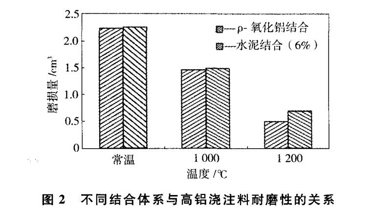 為了進(jìn)一步比較低水泥結(jié)合和無(wú)水泥結(jié)合高鋁澆注料的高溫耐磨性能,選用微粉代替 Secar71水泥(加入量為6%)作結(jié)合劑進(jìn)行了高溫耐磨性試驗(yàn)。圖2為不同結(jié)合體系與高鋁澆注料高溫耐磨性的關(guān)系。由圖2可看出,材料在各試驗(yàn)溫度下的耐磨性差別較小,但在高溫(1200℃)條件下,無(wú)水泥澆注料的耐磨性稍好一些。這可能是由于ρ-AL2O3微粉結(jié)合的高鋁質(zhì)澆注料在1200℃時(shí)產(chǎn)生的玻璃相相對(duì)較少,從而使其具有較高的強(qiáng)度。