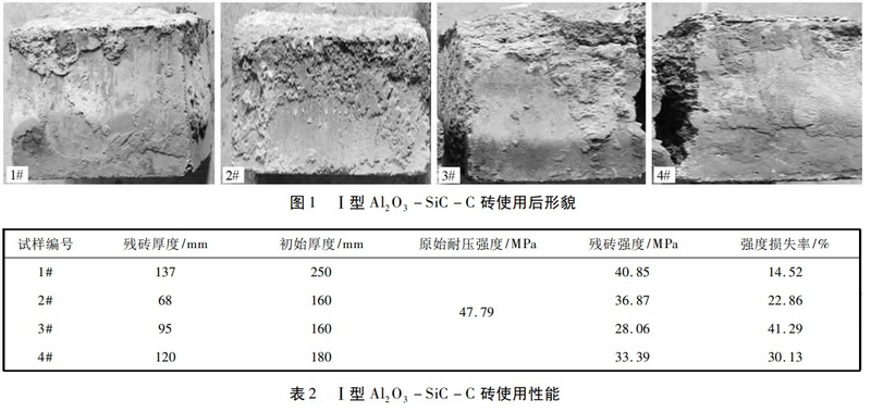 某鋼廠采用“一包到底”工藝,高爐受鐵、鐵水運輸、KR攪拌脫硫等操作完全在鐵水包內(nèi)進行。目前鐵水包容量為300 t和210 t,KR脫硫率為100%,脫硫攪拌頭轉速120~160 rad /min ,脫硫時間20~25 min,脫硫劑為石灰+氟化鈣,噸鐵消耗13~16 kg。前期選Ⅰ型Al2O3-SiC -C磚作為鐵水包的工作襯,侵蝕速率達0.6 mm /爐次,包壁侵蝕不均勻,尤其是渣線部位侵蝕嚴重。為研究高脫硫比鐵水包內(nèi)Ⅰ型 Al2O3-SiC-C磚的侵蝕機理,提高鐵水包在線運行的安全性,需對Ⅰ型Al2O3-SiC-C磚進行性能分析。Ⅰ型Al2O3-SiC-C磚使用后形貌及實際性能分別見圖1和表2。