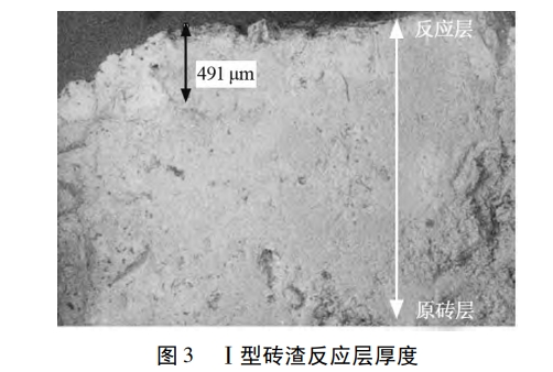 圖3為Ⅰ型 Al2O3-SiC-C 磚使用后磚渣反應層厚度。可見,拆解后的Ⅰ型Al2O3-SiC-C 磚反應層厚度很薄,說明反應產(chǎn)生的低熔物較多,磚面幾乎沒有保護層,導致低熔物不斷生成,連續(xù)被鐵水沖刷消耗,侵蝕速度大大增加。